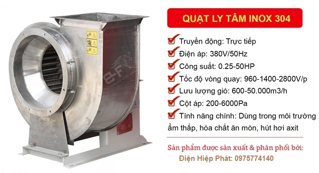 Quạt ly tâm inox 7.5HP do công ty Điện Hiệp Phát cung cấp được gia công và chế tạo từ chất liệu thép tấm không gỉ SUS 304 đạt được độ bền cao nhất. Quạt ly tâm inox 304 có lực hút mạnh, cột áp tầm trung phù hợp để lắp đặt cho việc cấp thoát không khí theo đường ống dẫn trong những tòa nhà cao tầng, tầng hầm